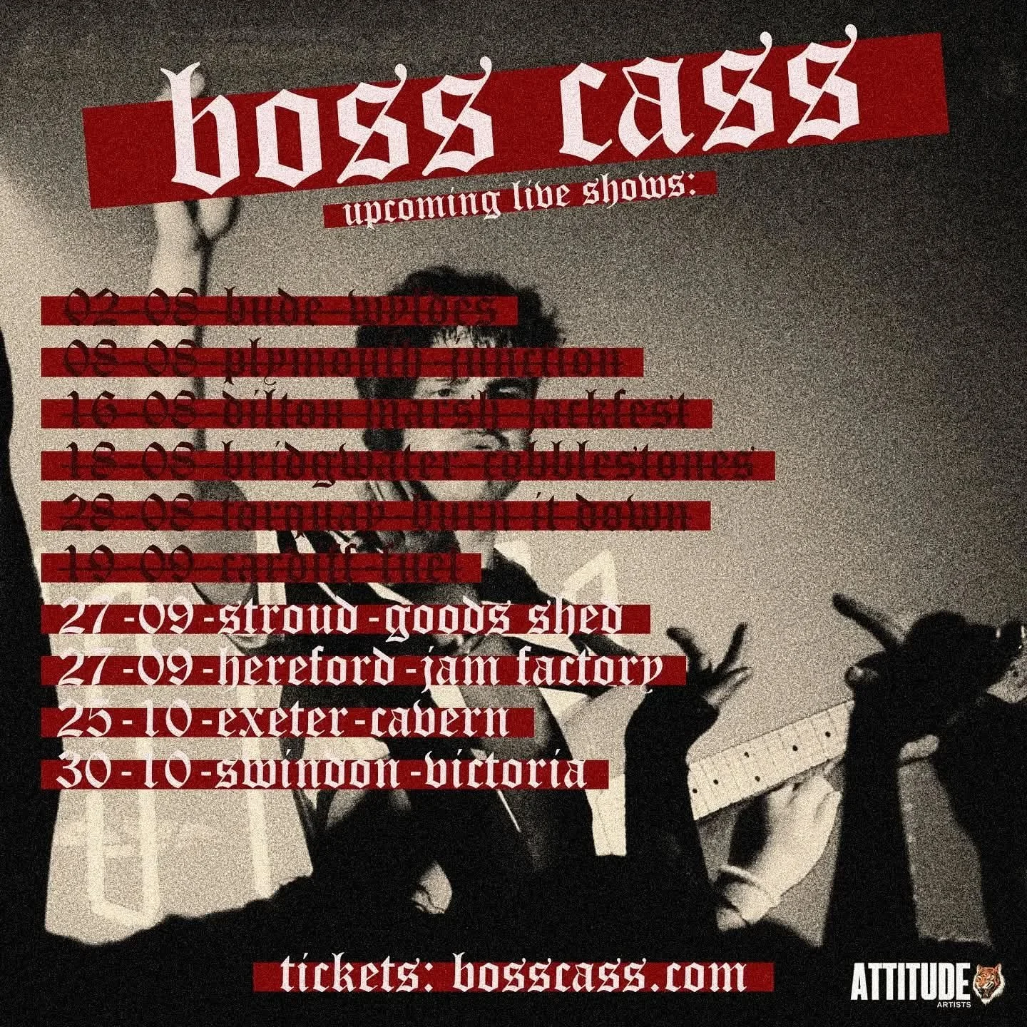 Since launching, Boss Cass has played over 120 live shows entirely independently with no outside influence, until now. His infectious stage presence has landed him coveted slots at festivals like Glastonbury 2023 and Boardmasters 2022 & 2023, Leopallooza, support slots for bands like Heavy Lungs, The Meffs, Carsick, Native James and loads more.